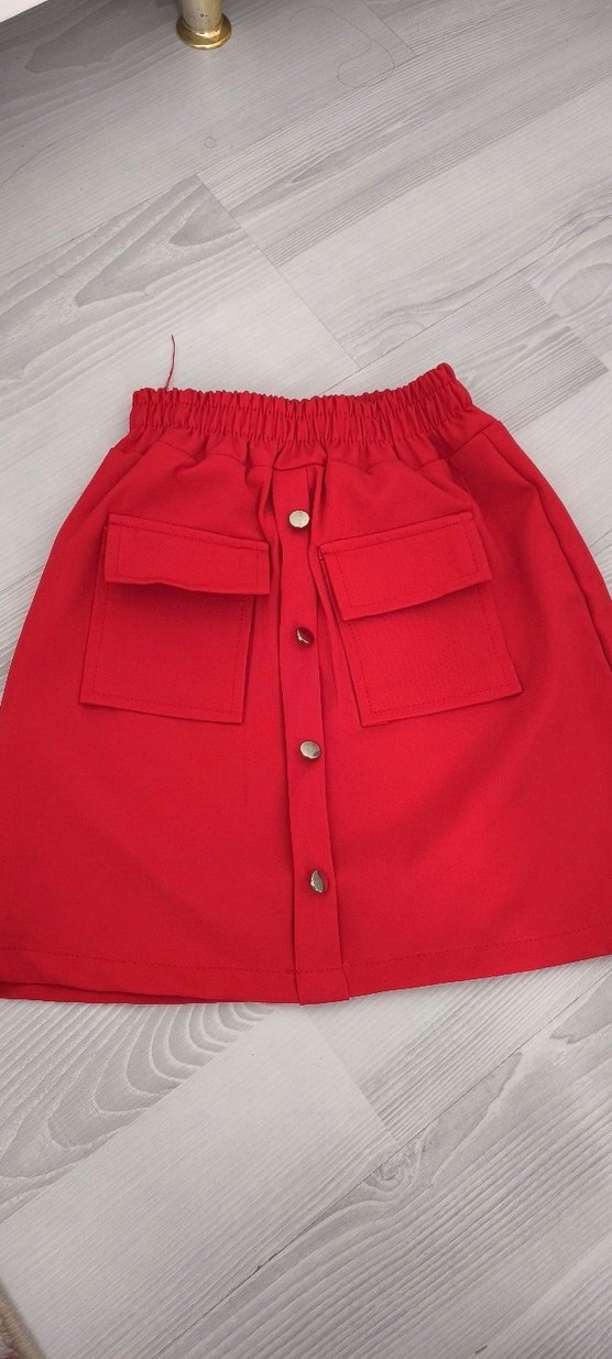 Kırmızı renkte, düğmeli ve önünde iki büyük cepli kız çocuk eteği. Rahat kesimli ve sentetik kumaştan, sokak stiline uygun.7-8 yaşa uygun