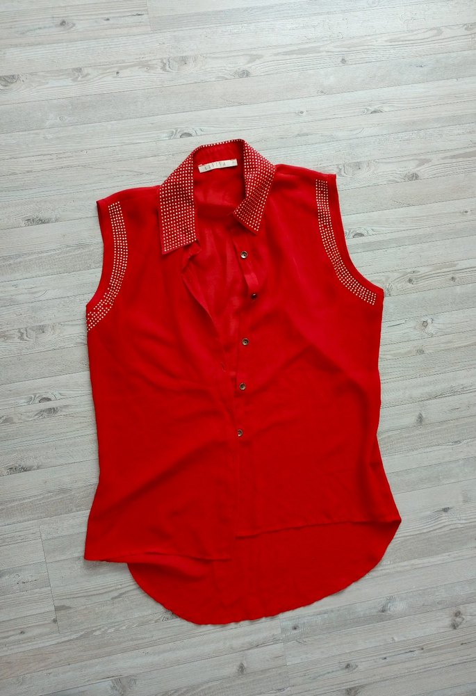 Kırmızı, kolsuz, düğmeli ve yakalı gömlek. Rahat kesimli, parlak görünümlü, suni kumaştan, günlük sokak stiline uygun midi boyda.