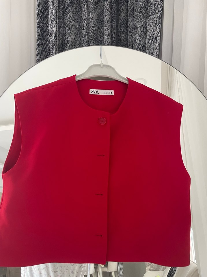 Düğmeli, kolsuz kırmızı yelek, yuvarlak yaka ve normal midi boyda. Rahat kesimi ve yumuşak, sıcak kumaşıyla ofis için uygundur.