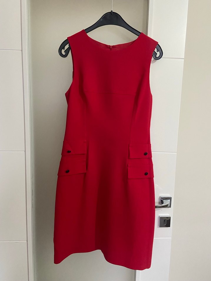 Kolsuz, yuvarlak yakalı ve yanlarda düğme detaylı kırmızı, vücuda oturan midi elbise. Modern klasik tarzda, ofis için uygun. ✨bir kez kullanıldı mağazadan alınmış yeni gibi