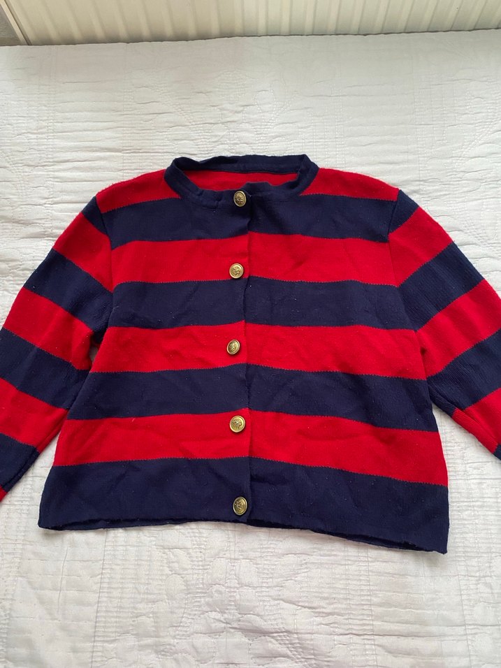 Bu kadın hırka, uzun kollu, yuvarlak yakalı ve düğmeli ön tasarıma sahiptir. Rahat kesimli ve yumuşak dokuludur, kırmızı lacivert geniş çizgilerle dikkat çeker. Günlük kullanım için uygundur.