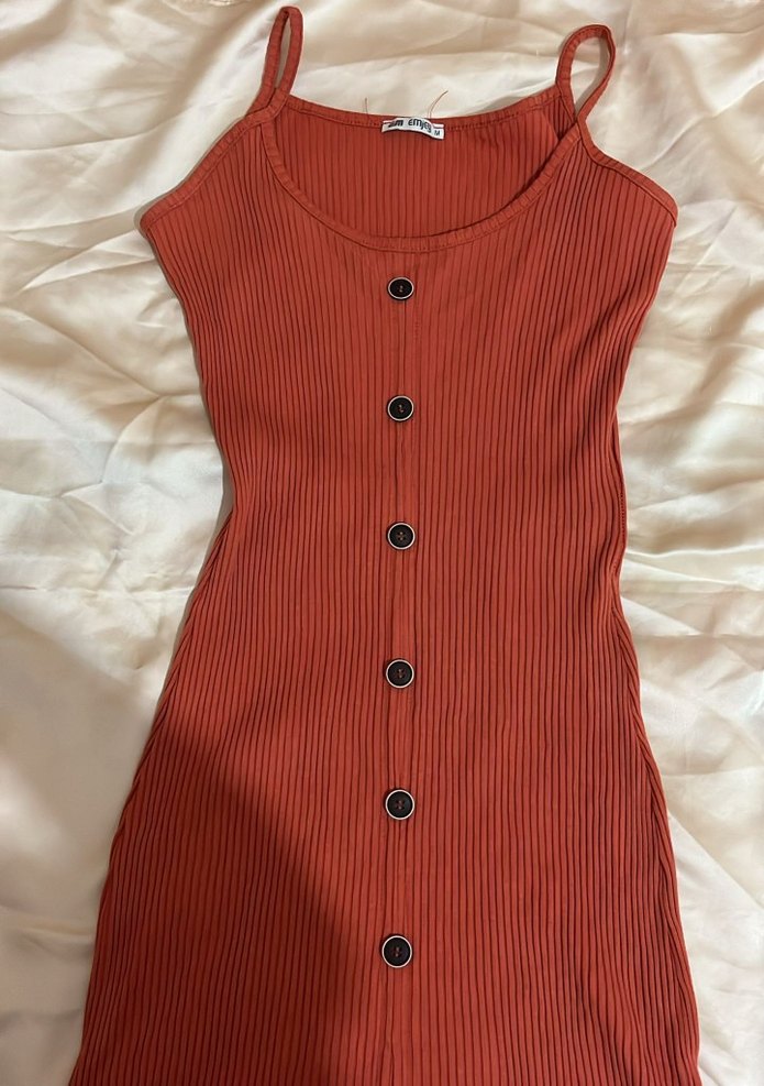 Düğmeli ve ince askılı, vücuda oturan kırmızı midi elbise. Sentetik kumaştan, parlak renkte, günlük kullanım için uygundur.