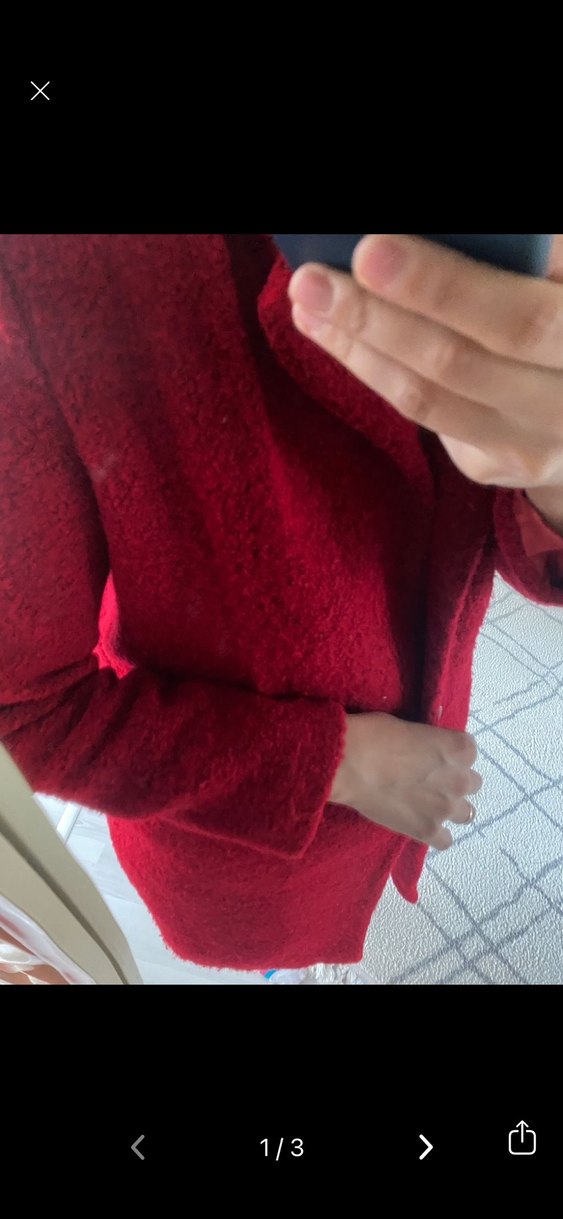Parlak kırmızı renkte, düğmeli, uzun kollu ve normal boyda kabanı. Rahat ve yumuşak kumaştan, günlük kullanıma uygun.