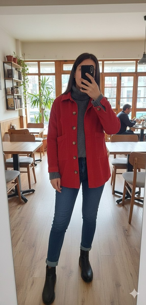 Düğmeli, kırmızı midi uzunlukta kadın ceket gömlek uzun kollu, Yumuşak ve sıcak kumaştan, günlük kullanıma uygun.