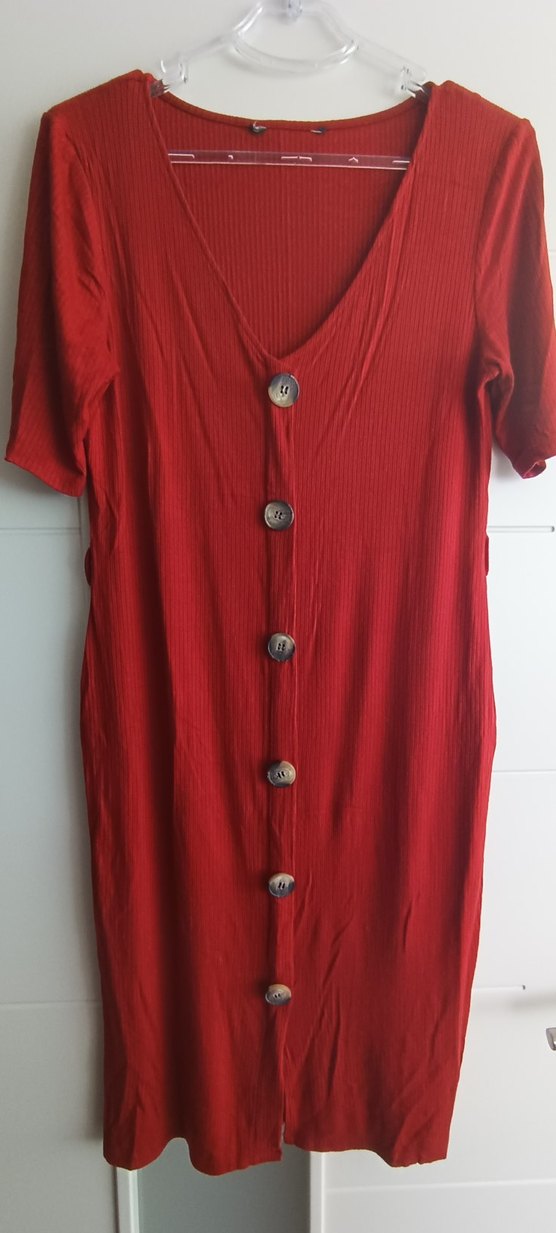 Düğmeli, V yaka, kısa kollu kırmızı midi elbise, yumuşak kumaştan, minimal ve bohem tarzda, vücuda oturan kesime sahip. Xl bedene kadar giyilebilir