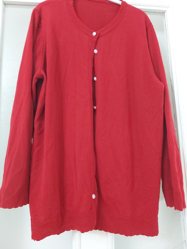 Düğmeli, uzun kollu, yuvarlak yaka kırmızı midi hırka. Keten kumaştan, parlak görünümlü, bol kesim, sade ve minimal tarzda.