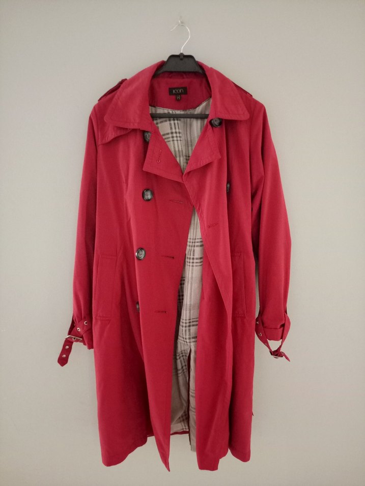 Düğmeli ve notched yakalı kırmızı midi trençkot. Uzun kollu, bol kesim ve sentetik kumaş. İç kısmı gri renkli, günlük şık sokak tarzı için uygun.
