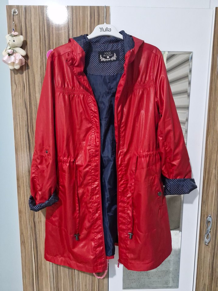 marka temsilidir. Kırmızı midi boy, düğmeli ve uzun kollu kadın yağmurluğu. Sentetik kumaştan, bol kesim ve kesimli yakaya sahip, günlük kullanıma uygun.