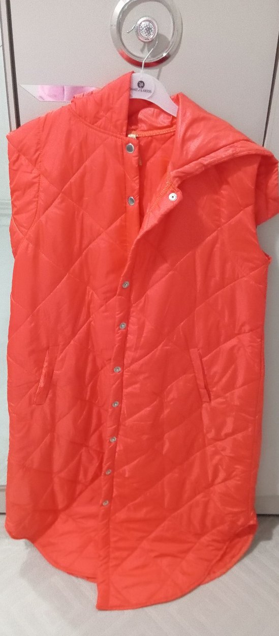 Düğmeli, yakalı ve kolsuz kırmızı yelek, sentetik kumaştan olup midi boyda ve bol kesimdir. Rahat ve sokak tarzına uygundur.