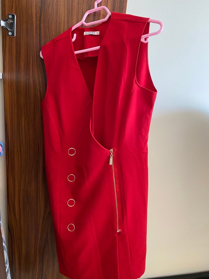 Düğmeli, V yakalı kırmızı kadın yelek, parlak sentetik kumaştan, midi boydur. Beden 38 beden için uygundur.