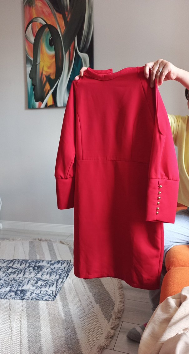 Düğmeli, uzun kollu, yüksek yakalı kırmızı , midi boyda ve dar kesimdir. Pürüzsüz sentetik kumaştan yapılmıştır, günlük sokak stili için uygundur.