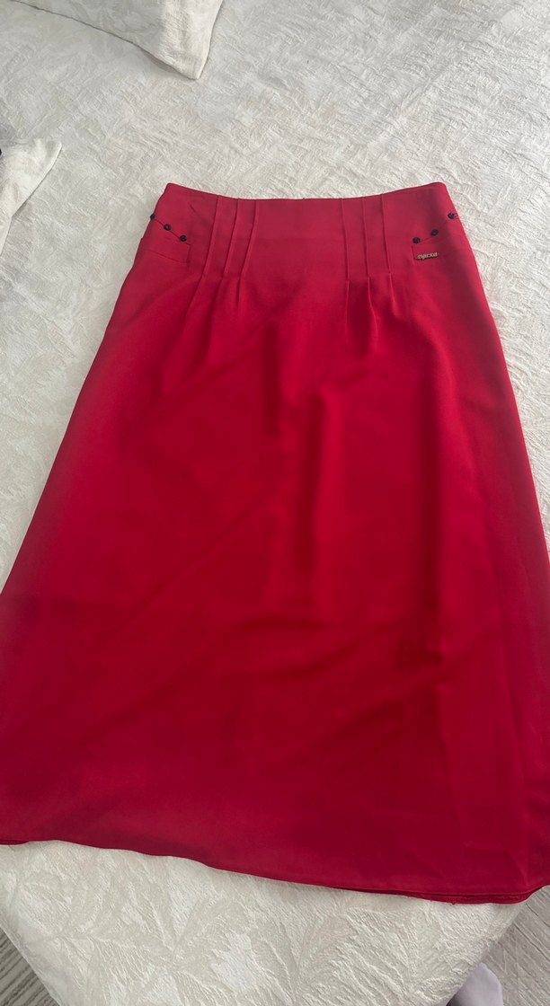 Düğmeli, kırmızı parlak saten kumaştan, bol kesim midi uzunlukta kadın eteği. Günlük kullanıma uygun sade tasarım.