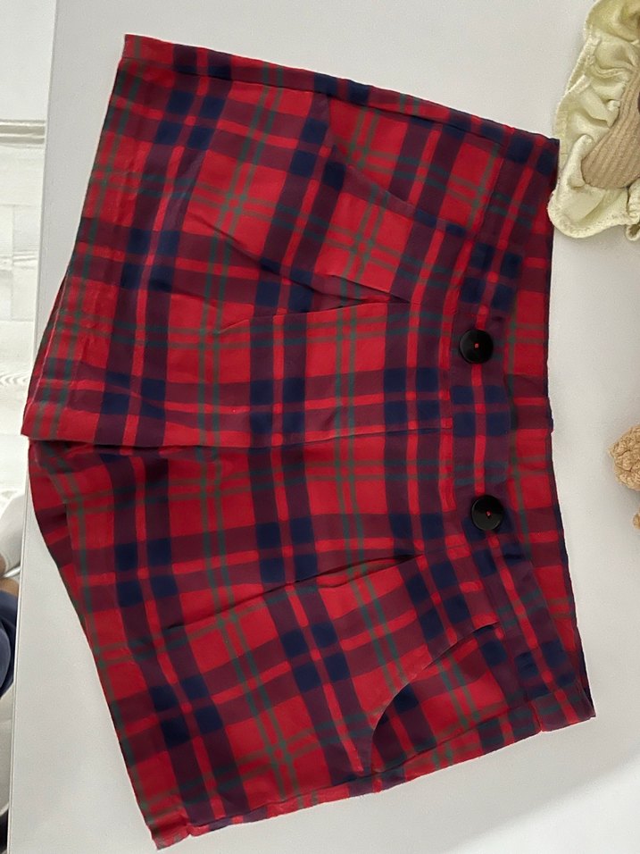 Düğmeli detaylı, koyu kırmızı renkli, sentetik kumaştan yapılmış, bol kesim midi şort. Sokak stili ve gündelik kullanıma uygundur.