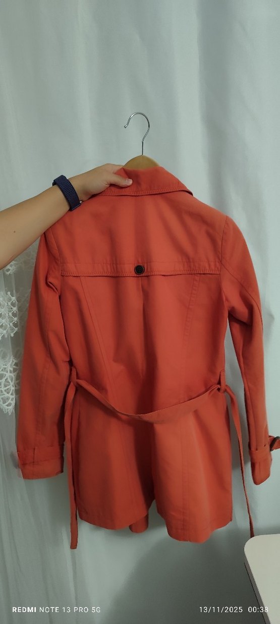 Düğmeli kırmızı trençkot, yakalı ve uzun kolludur. Sentetik kumaştan üretilmiş, belden kemerli ve dar kesimdir. Günlük sokak stili için uygundur.