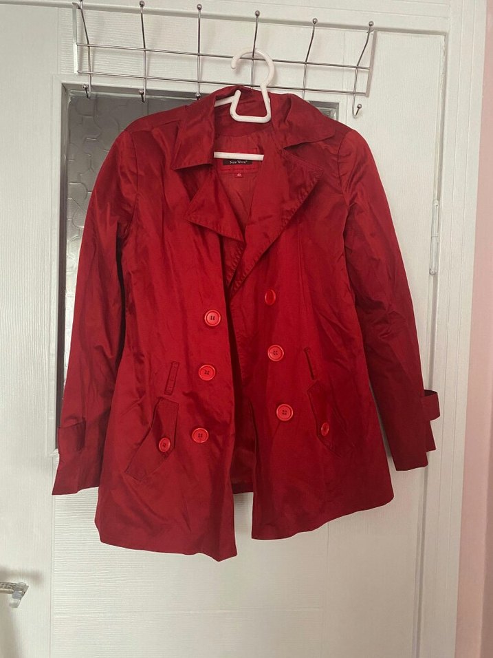 Parlak kırmızı sentetik kumaştan yapılmış, düğmeli ve yakalı, uzun kollu, midi boy, dar kesim trençkot. Günlük sokak stili için uygundur. giyilmedi