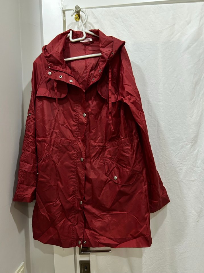 Parlak kırmızı renkte, düğmeli ve bol kesim midi yağmurluk. Uzun kollu ve yakası kesik detaylı, günlük sokak stili için uygun. ️