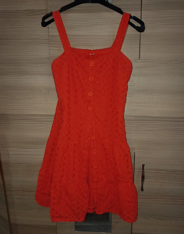 Düğmeli, kırmızı mini elbise, geniş askılı ve vücuda oturan kesime sahiptir. Yumuşak sentetik kumaştan yapılmış, bohem tarzda günlük kullanıma uygundur.