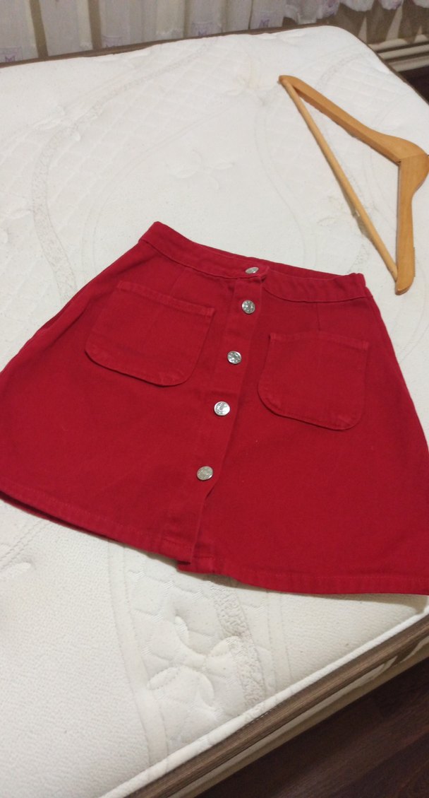 Düğmeli ve iki cepli, sentetik kumaştan üretilmiş kırmızı renkli, bol kesim mini etek.
