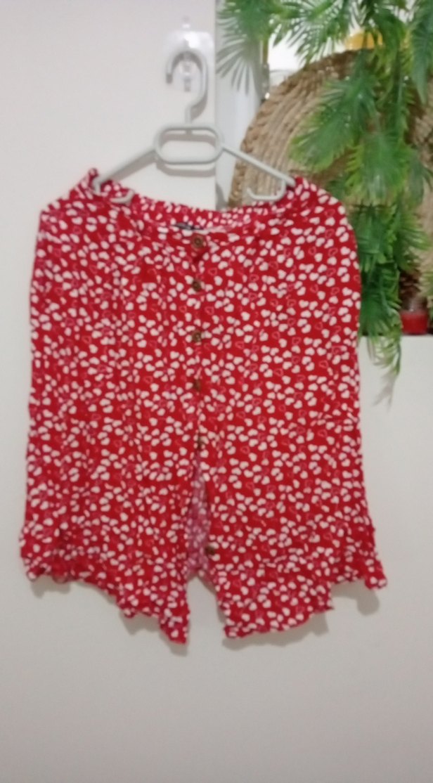 Renkli batik desenli, düğmeli ve bol kesim kırmızı mini hamile eteği, yumuşak pamuktan üretilmiştir. Bohem tarzı için uygundur.
