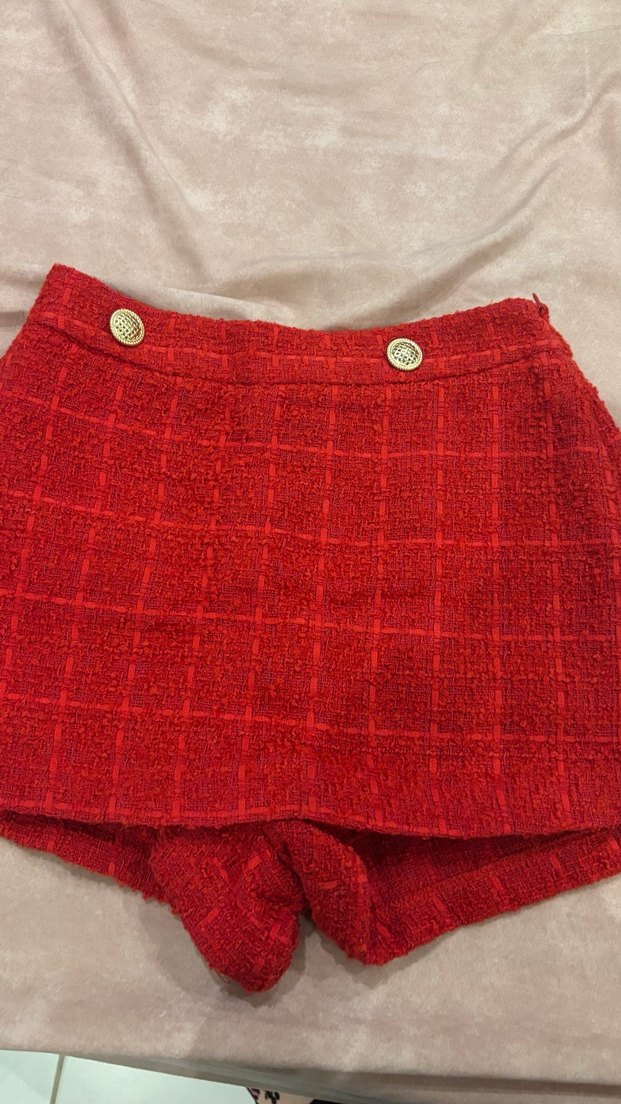 Parlak kırmızı, düğmeli yüksek belli mini şortlar. Rahat sentetik kumaştan, günlük sokak stiline uygun, sıkı kesim.