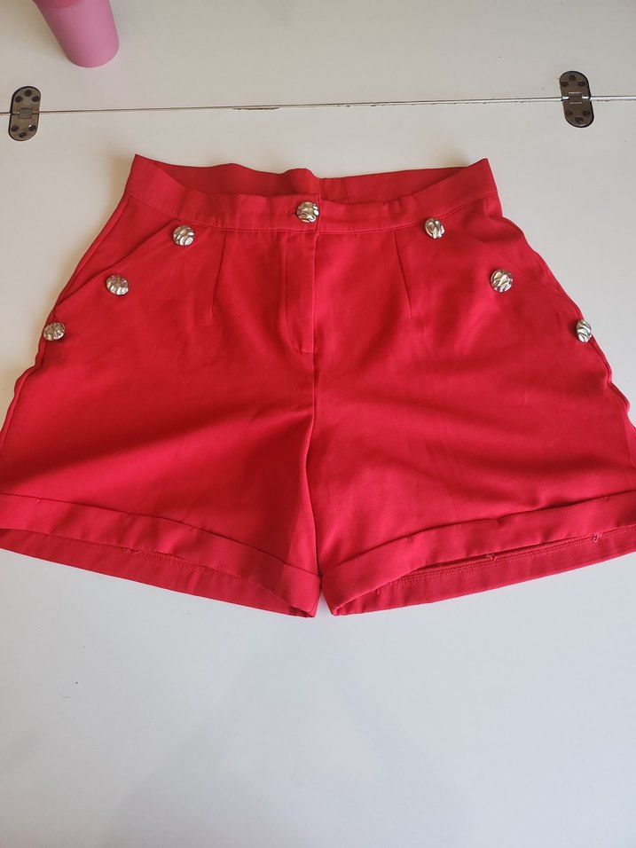 Düğmeli detaylara sahip, bol kesim kırmızı mini şort, günlük kullanıma uygun yumuşak ve parlak kumaştan üretilmiştir. marka ve beden etiketi yoktur 59 kilo da denemiştir ürün Bana bir tık Bol geliyor