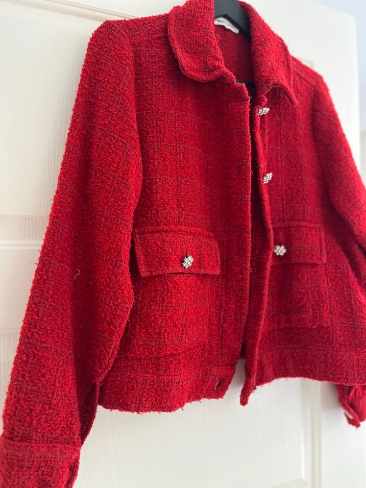 Düğmeli, yün kumaştan yapılmış kırmızı kadın ceketi. Notched lapel yakalı, uzun kollu ve kısa boydadır. Günlük kullanıma uygundur. ✨