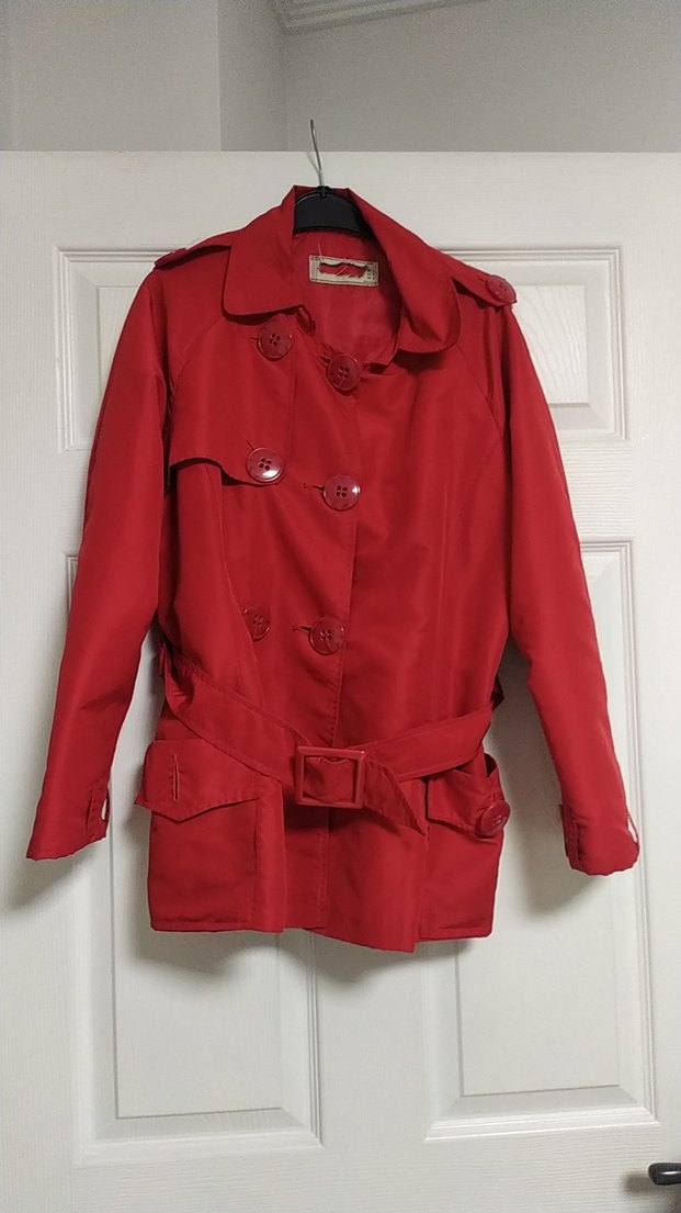 Düğmeli ve kemerli, kırmızı naorobin kumaştan yapılmış, klasik yaka ve uzun kollu midi trençkot. Vintage tarzıyla günlük kullanıma uygundur. yağmurluk kumaşı,75 kg ya kadar giyilir,temiz