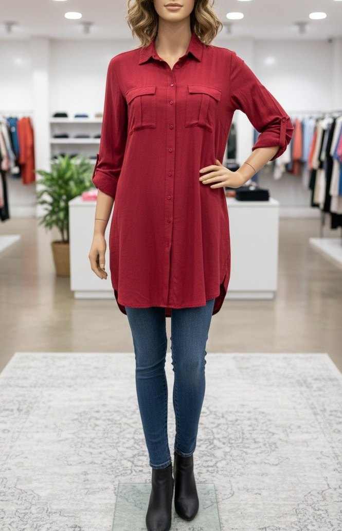 Fotoğrafta canlı renk çıktı ama normalde bordo kırmızısı, pamuklu kumaştan, düğmeli, uzun kollu ve yakalı, bol kesim midi uzunluğunda kadın gömlek tunik. Rahat ve gündelik kullanıma uygun.