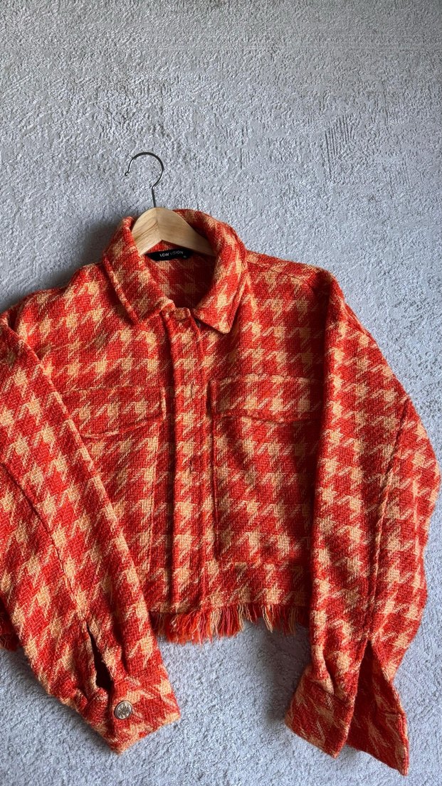 Düğmeli, uzun kollu ve yakalı kırmızı salaş kadın ceketi. Parlak turuncu batik deseni ve sentetik kumaştan yapılmıştır, rahat bir his sunar. Bohem ve retro tarzda, günlük kullanıma uygundur.