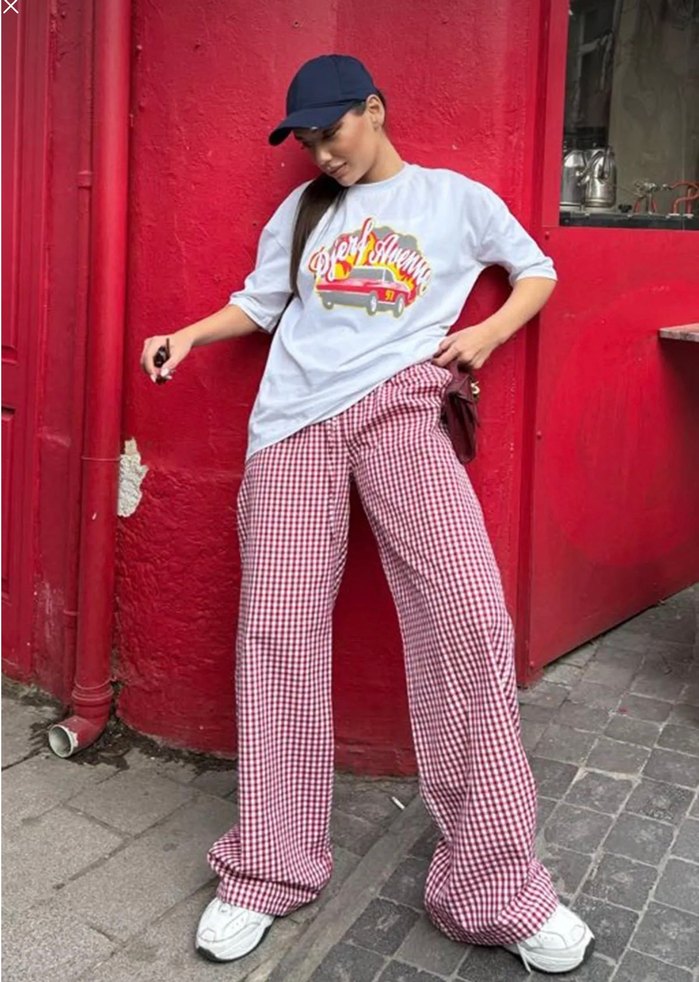 Koton kumaştan üretilmiş, düğmeli ve bağlama desenli kırmızı salaş kadın pantolon, günlük rahatlık ve sokak stili için uygundur.