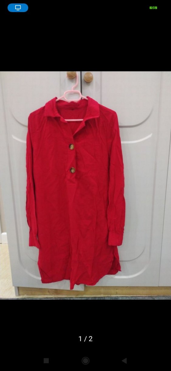 Kırmızı süet kumaştan, uzun kollu, yakalı ve düğmeli midi uzunlukta, salaş kesim kadın gömlek. Günlük sokak stiline uygun.