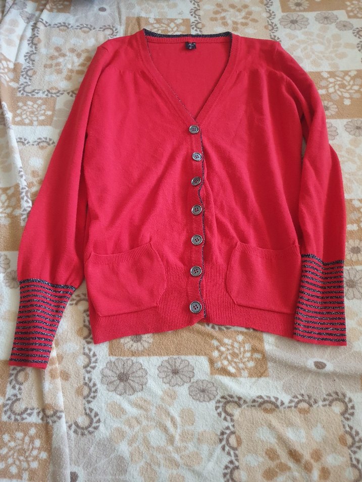 Kırmızı triko hırka, V yaka ve düğmeli uzun kolludur. Salaş kesimi ve iki ön cebi vardır. Kolların manşetinde çizgili detay bohem tarzı yansıtır.