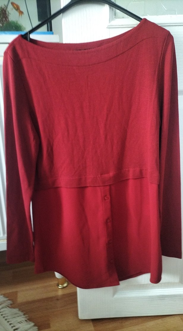 Düğmeli, uzun kollu, yuvarlak yakalı koyu kırmızı tunik. İpeksi dokulu, rahat ve sade tasarımıyla günlük kullanıma uygun.
