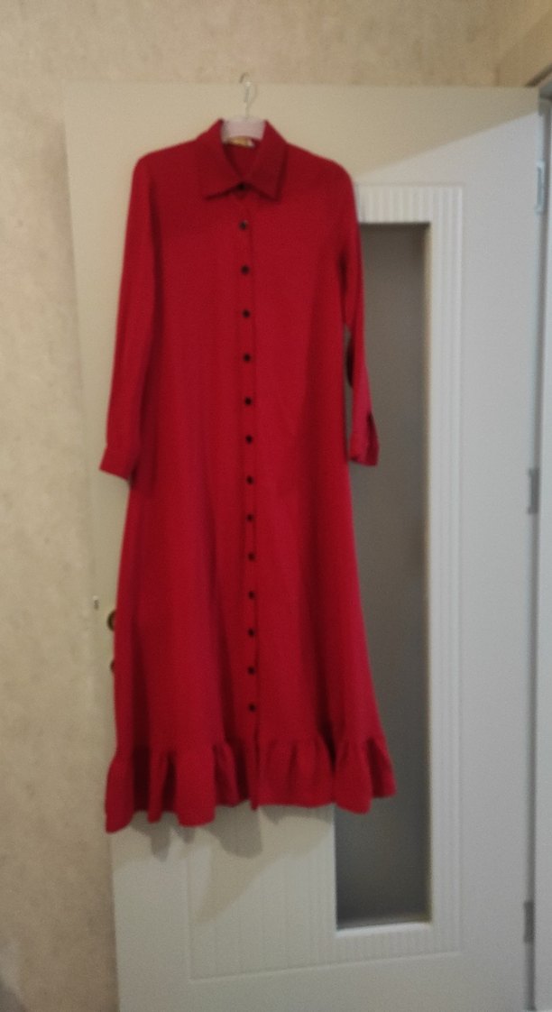 kırmızı keten kumaştan, uzun kollu, düğmeli gömlek elbıse bırkac kez gıyıldı cok iyi durumda