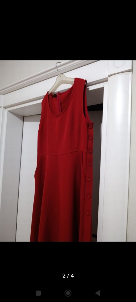Kolsuz, V yaka ve yan düğmeli kırmızı uzun elbise. İpeksi kumaştan, rahat ve salaş kesim, sokak modasına uygun. ✨