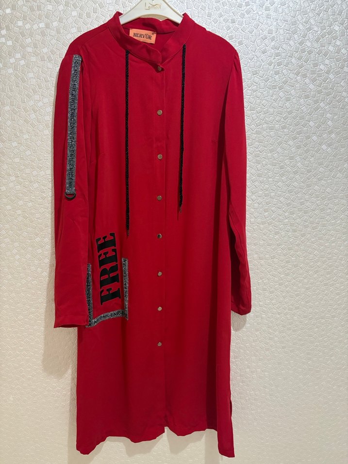 Düğmeli ön ve uzun kollu, bol kesim kırmızı uzun tunik. Sentetik kumaştan, işlemeli detaylı ve çıtçıtlı yakalı, günlük sokak stili için uygun.