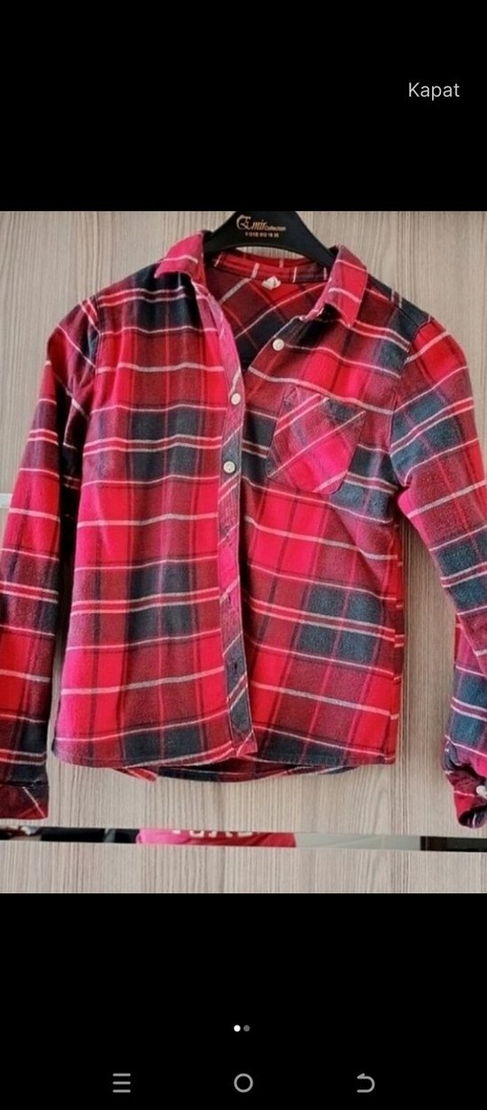 için düğmeli, yakalı ve uzun kollu gömlek. Sentetik kumaştan üretilmiş, koyu kırmızı tie-dye desenlidir. Günlük sokak stiline uygundur.