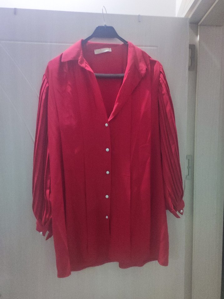 İpeksi kumaştan, düğmeli ve V yakalı, uzun kollu, midi boyda kırmızı salaş kadın gömleği. Ofis kullanımına uygun.