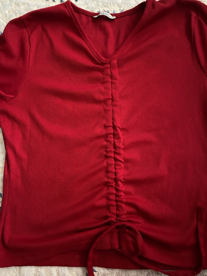 Düğmeli ve büzgülü ön detaylı, uzun kollu kırmızı V yaka Yumuşak keten kumaştan, günlük kullanım için uygun.