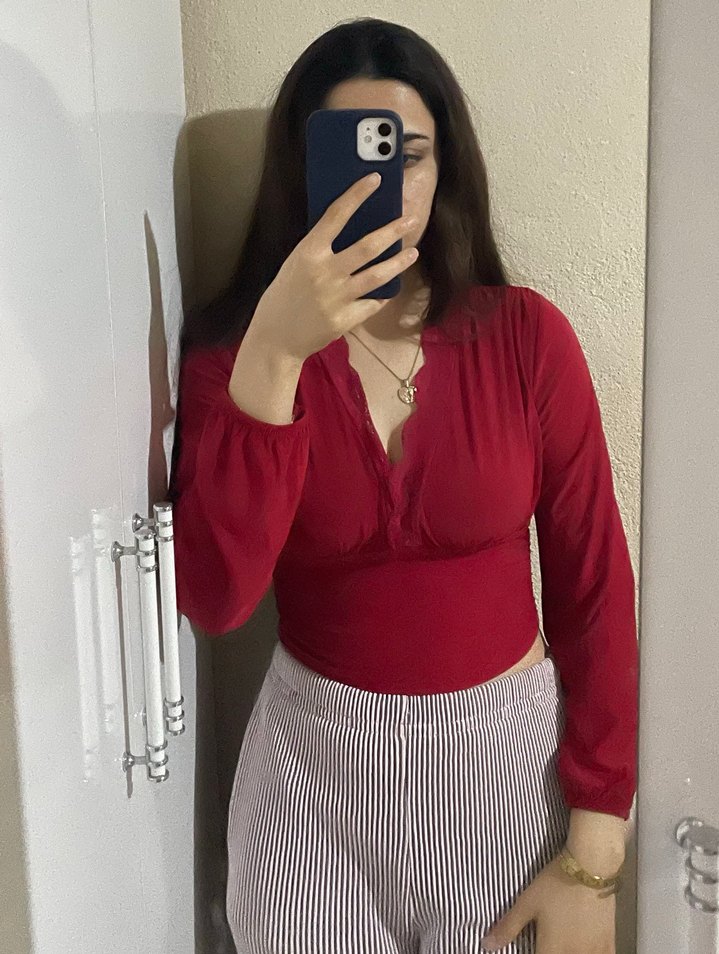 V yaka, uzun kollu ve düğmeli, kırmızı tonlarında kadın bluz, rahat ve şık günlük kullanım için uygundur. Yeni giyilmedi