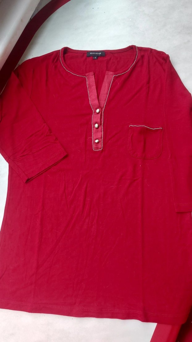 Kırmızı keten bluz, düğmeli V yaka ve kısa kolludur. Bol kesim ve parlak dokusu ile gündelik kullanıma uygundur.