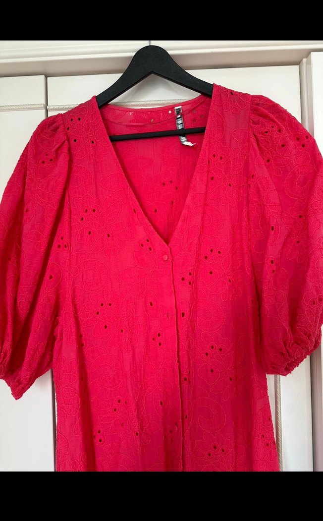 Düğmeli, V yakalı, bol kesim uzun hamile bluzu. Parlak kırmızı, nakışlı, kısa balon kollu ve yumuşak keten kumaştan. Romantik akşamlar için bohem tarzda.
