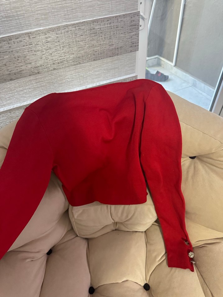 Düğmeli, uzun kollu ve yüksek yakalı kırmızı kadın kazak. Yumuşak ve rahat kumaşıyla sokak stiline uygun midi boyda, şık bir parça.