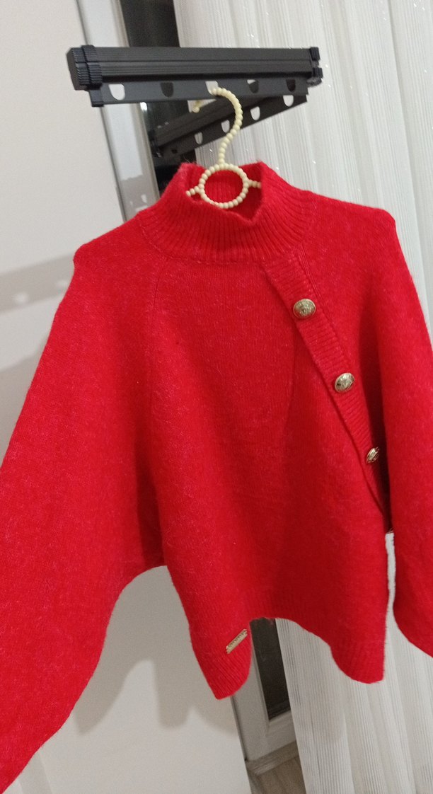 Düğmeli Kırmızı Yüksek Yakalı Kadın Kazak