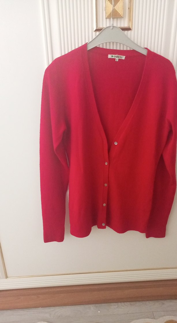 Düğmeli, bol kesim kadın hırka parlak kırmızı renkte, V yakalı ve uzun kolludur. Yumuşak yün kumaştan, rahat ve midi boyda, günlük kullanıma uygundur.