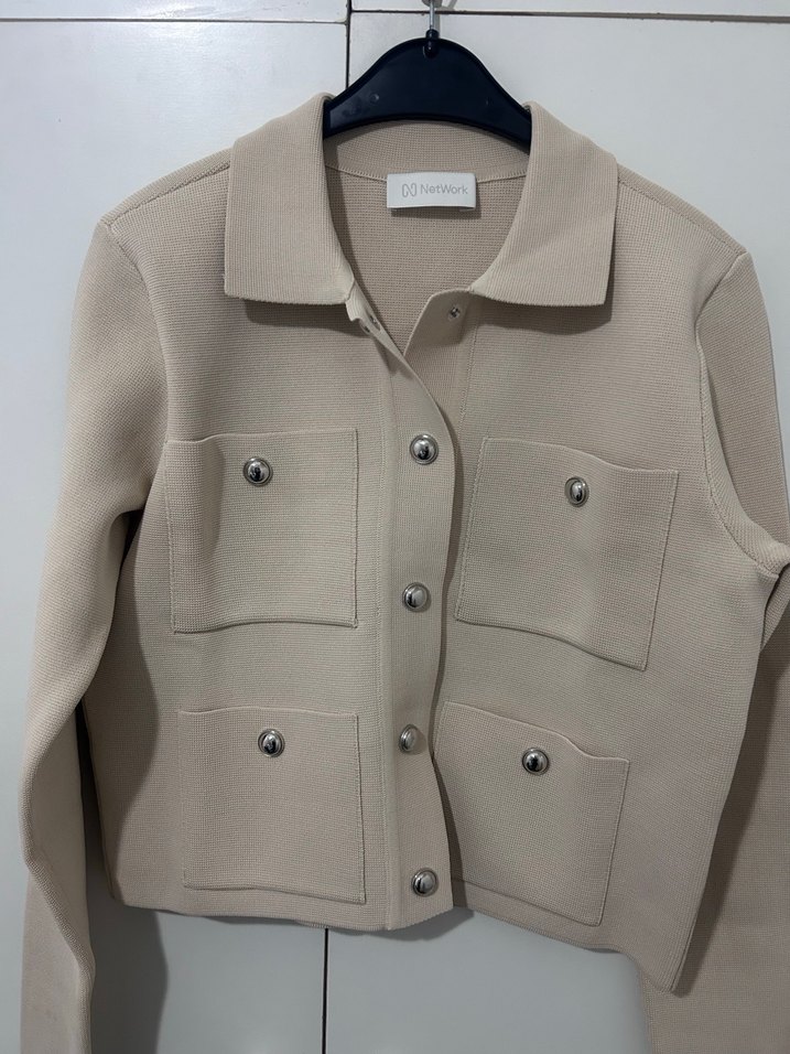 Düğmeli, kısa kesim bej kadın ceket, uzun kollu ve kesik yaka detaylıdır. Dört cepli, regular fit ve günlük kullanım için uygundur.