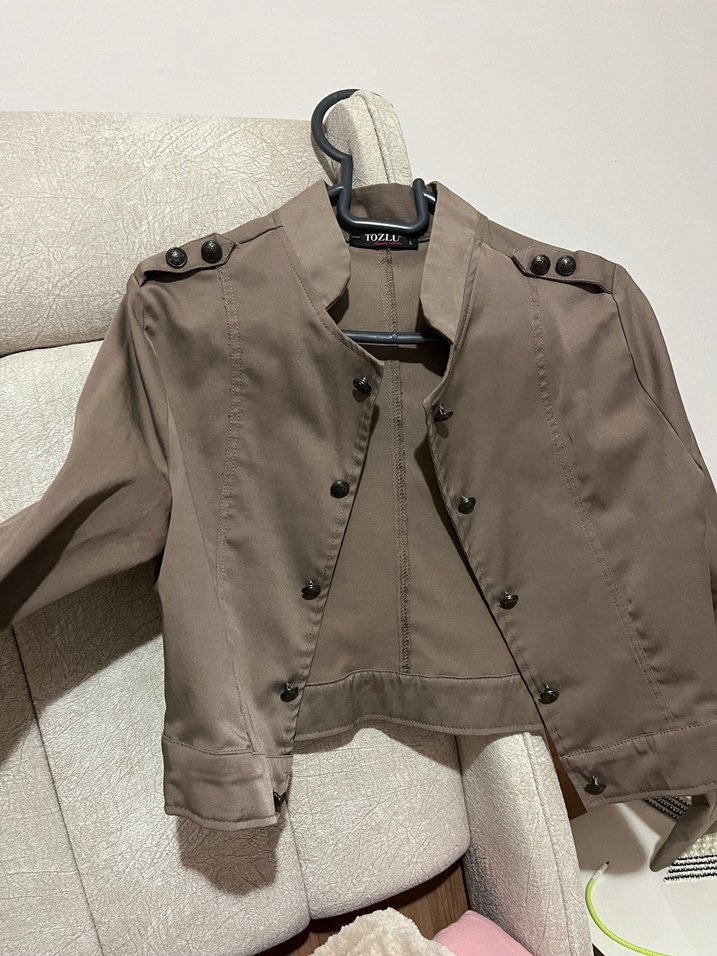 Düğmeli, kısa kesim ve fit kesime sahip uzun kollu bej kadın ceket. Suni kumaştan üretilmiş, rahat sokak stili için uygun. Rahat esnek kumaşı vardır.rengi çok hoş vizon tonundadır.