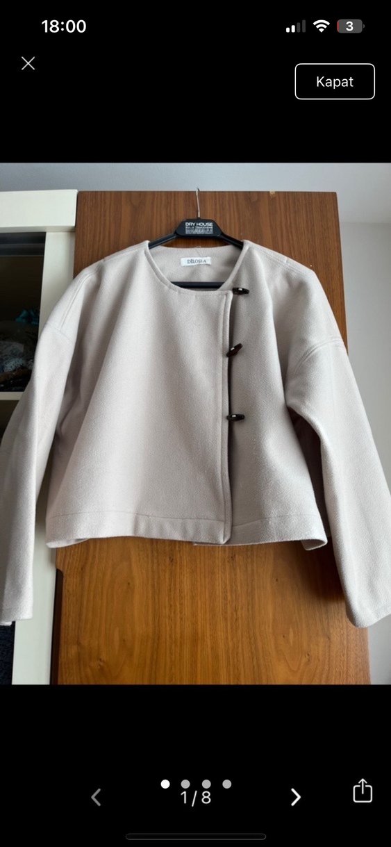 Bej renkli, düğmeli, uzun kollu ve kısa kesim kadın kaban. Yumuşak ve sıcak kumaştan, günlük kullanım için uygun.