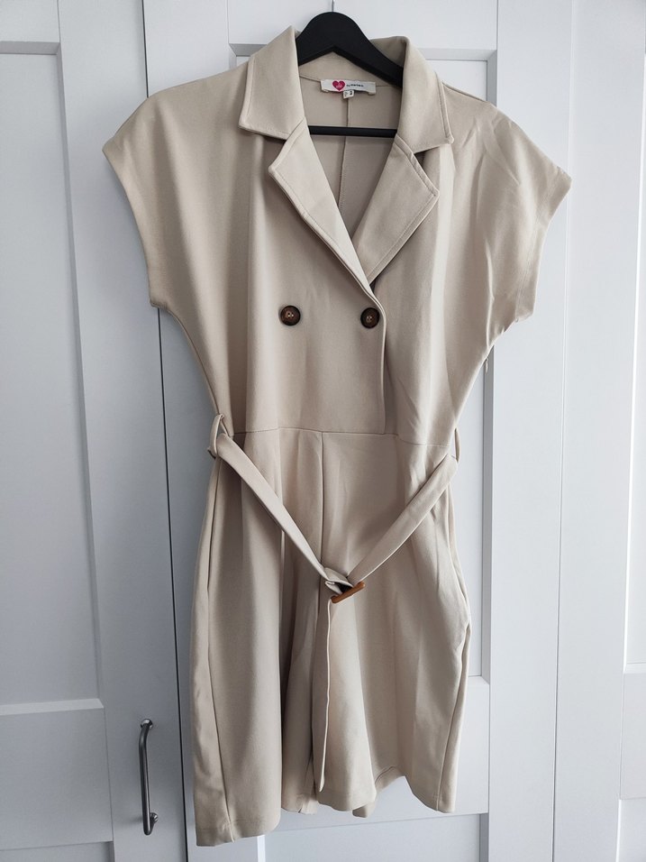 Düğmeli, yakalı ve kemerli kısa bej tulum. Kolsuz, regular fit ve düz dokulu kumaştan yapılmıştır. Ofis ve günlük şıklık için uygundur. ( hiç giyilmemiştir)
