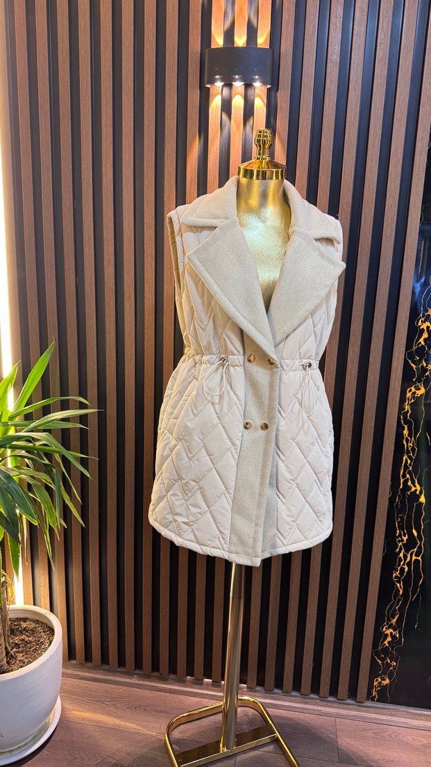 Düğmeli, kısa kesim, beyaz renkli kadın yelek. Yumuşak ve sıcak dokulu, kolsuz, notched lapel yakalı, rahat kesim, günlük sokak stiline uygun.